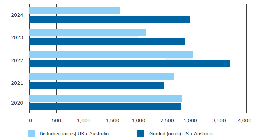 Land rehabilitated vs disturbed 2024 2023 Disturbed (acres) US + Australia Graded (acres) US + Australia Learn More LAND REHABILITATED VS DISTURBED