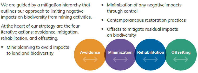 Mitigation Hierarchy We are guided by a mitigation hierarchy that outlines our approach to limiting negative impacts on biodiversity from mining activities. Avoidance Minimization Rehabilitation Offsetting Learn More MITIGATION HIERARCHY